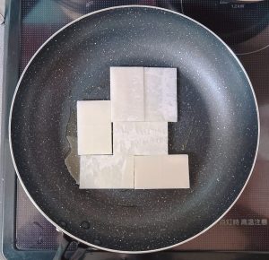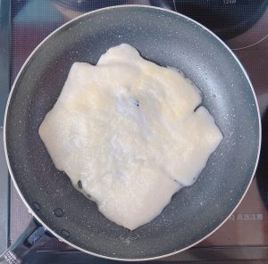 "フライパンに薄く油を塗り、餅を並べます。