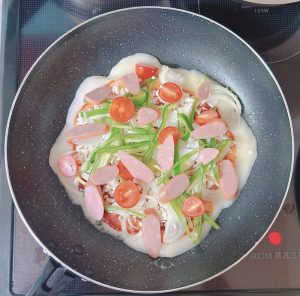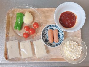 "合わせた☆を塗り、チーズ、野菜、ウインナーをのせます。